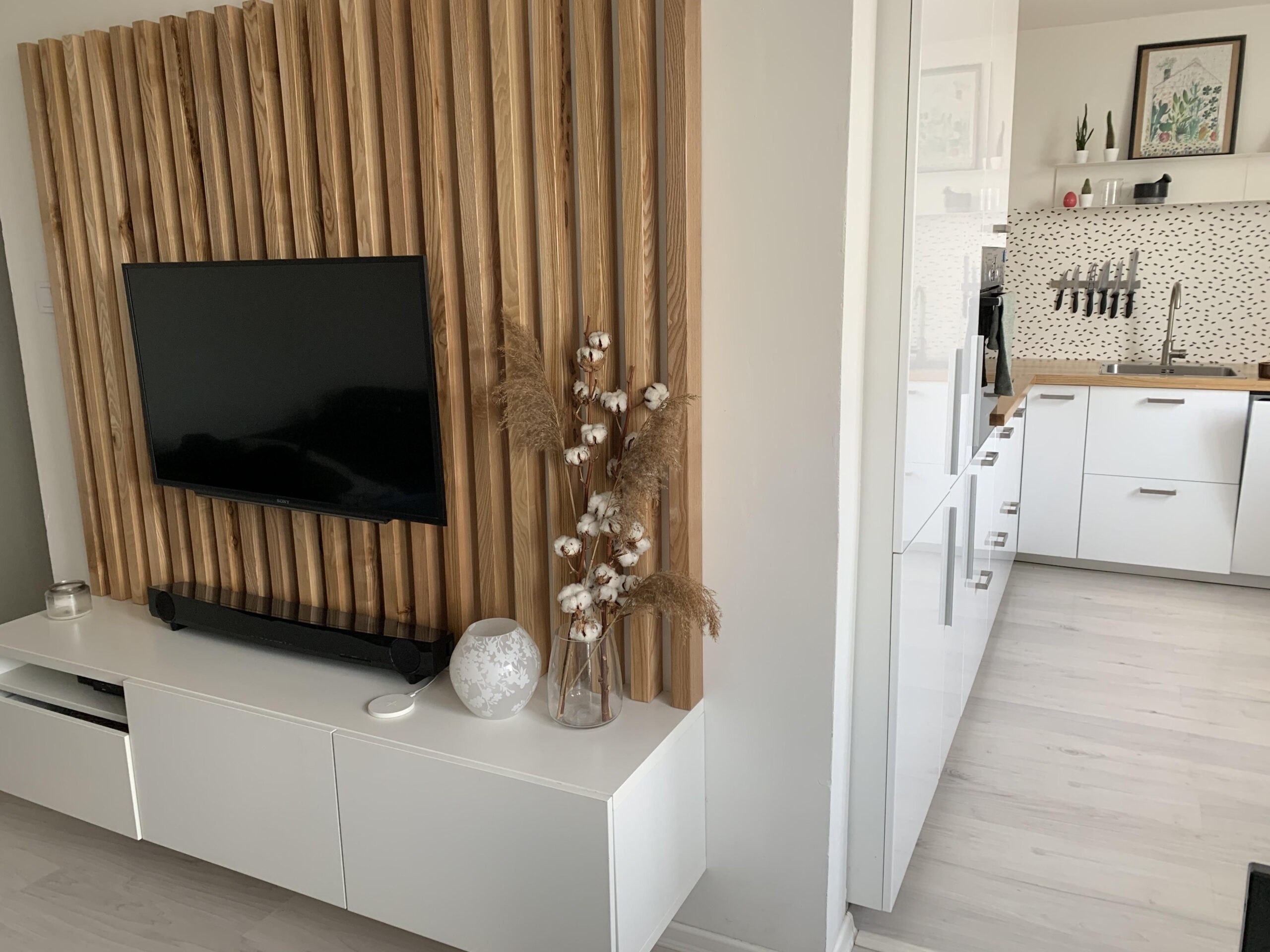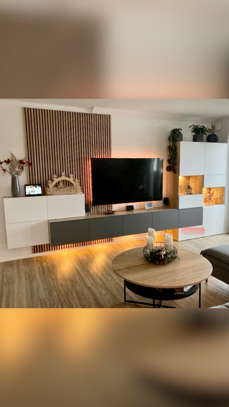 wandverkleidung | ikea besta tv-board 📺, 🪵 wandverkleidung im wohnzimmer von @naze_dogu , @naze_dogu zeigt euch hier, wie das ergebnis aussieht, wenn du 2 stück akustikpaneele einfach nebeneinander